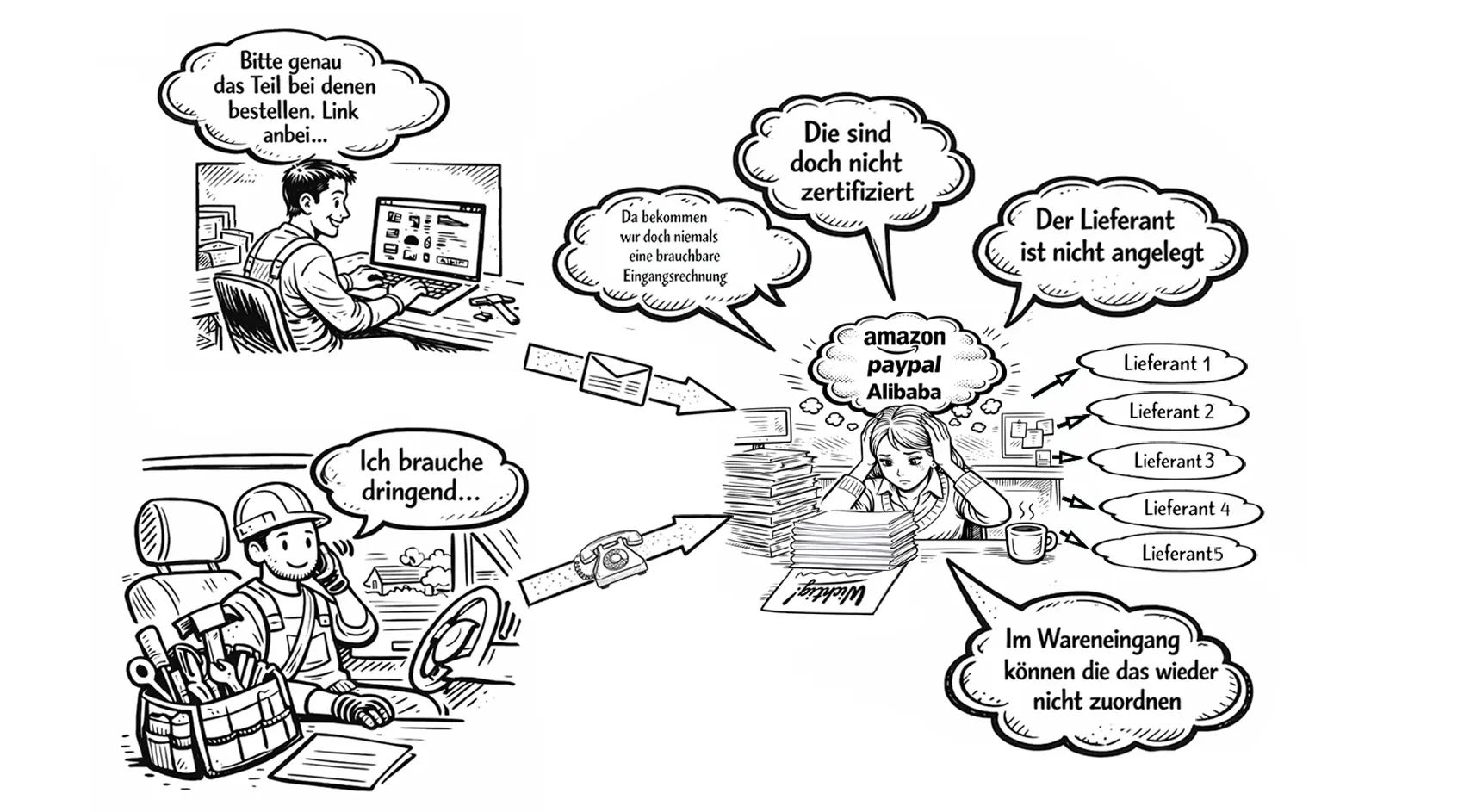 Der Anforderer hat bereits Zeit in die Vorauswahl von Produkt und Bezugsquelle investiert. Wie immer, muss alles schnell gehen. Es ist nicht zu erkennen, dass sich das angeforderte Produkt bei einem bestehenden Lieferanten beziehen lässt.