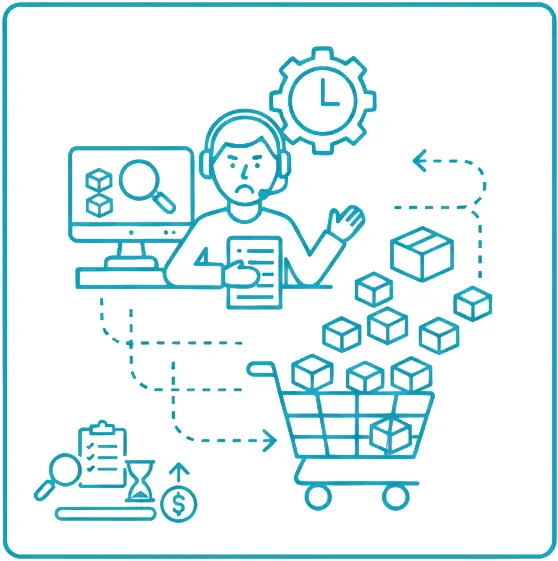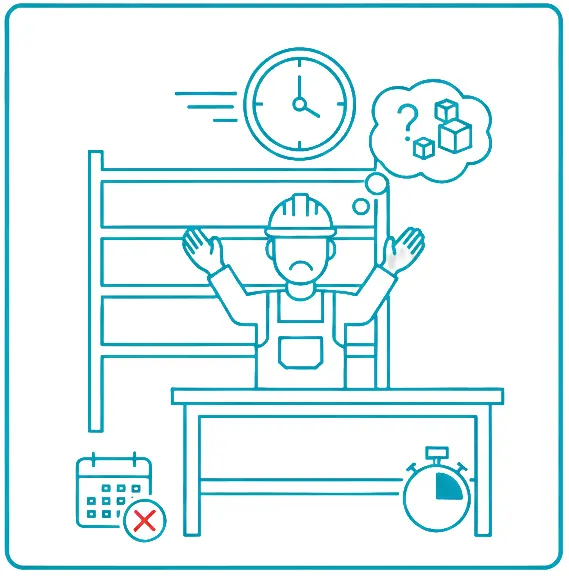 Mitarbeiter suchen Teile auf Lager oder warten auf fehlende Komponenten – die Arbeit steht still, obwohl sie beginnen könnte.